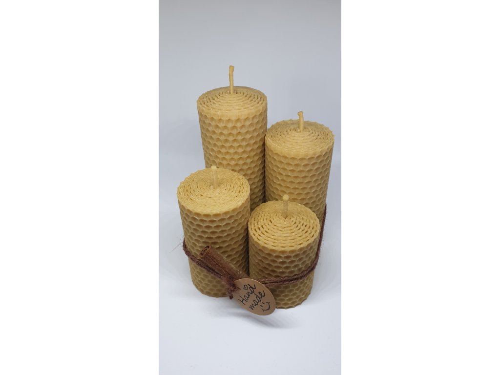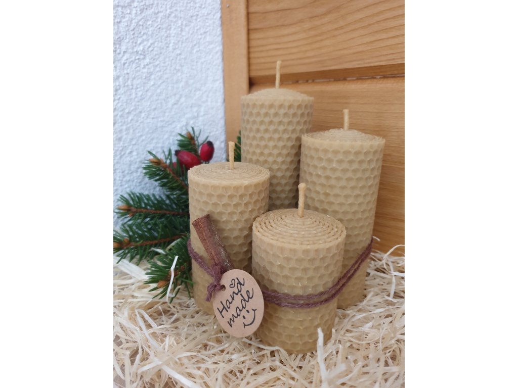 Adventná sada 4ks sviečok, ručne točená z medzistienok z prírodného včelieho vosku. Sada je zložená zo sviečok o výške 120mm, 100mm, 80mm a 60mm, všetky so šírkou 45mm. Vo sviečkach je použitý bavlnený knôt, ktorý je zafixovaný plieškom na knôty aby sviečky dobre dohoreli dokonca.